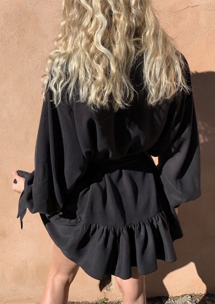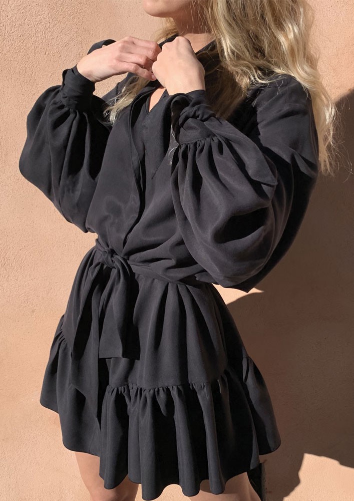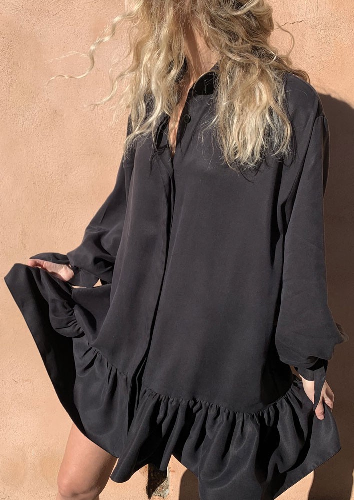 La robe chemise Romee se distingue par sa coupe ample et oversize, cintrée ou non grâce à sa ceinture à nouer à la taille. Elle est pourvue de manches bouffantes soulignées par ses poignets à nouer. La patte de boutonnage est dissimulée, pour une silhouette épurée. La robe s'achève d'un ourlet aérien à empiècements volantés.