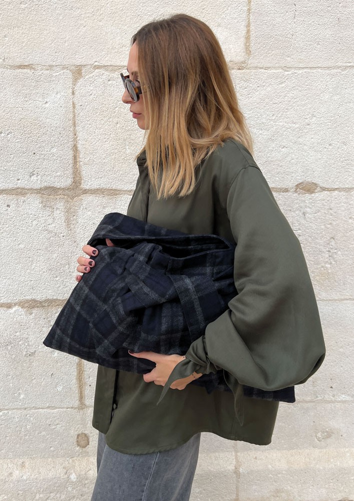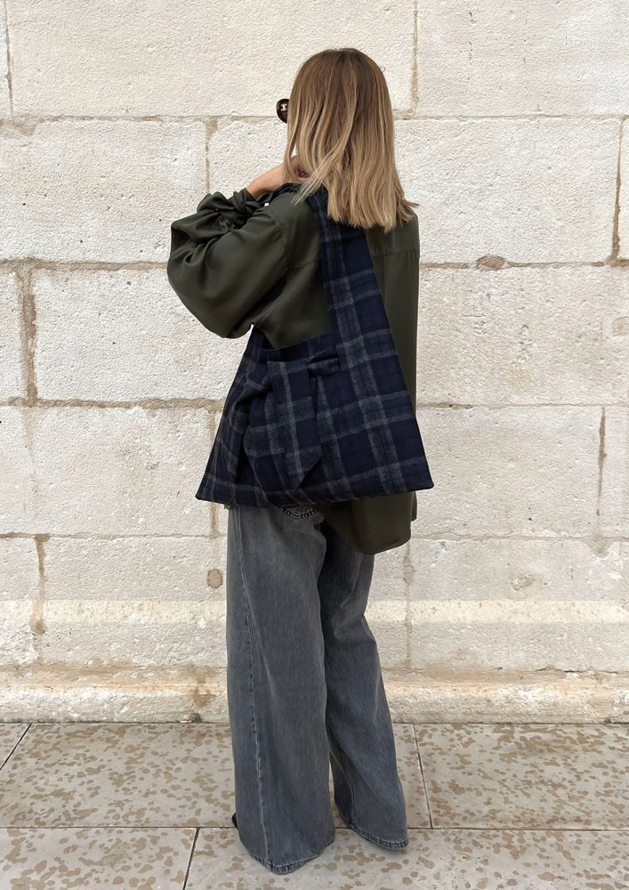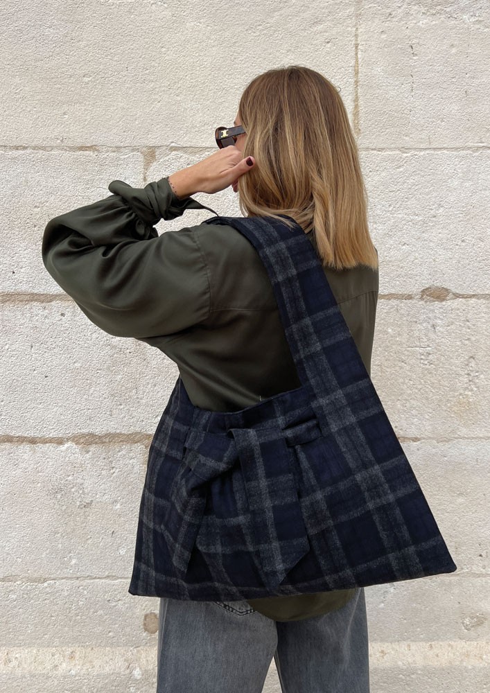 Le sac Léon se porte à l'épaule. Il est réalisé en laine vierge certifiée "tissu invendu de haute-couture". Il est entièrement doublé. Il se distingue par son lien à nouer au devant du sac. Il possède une poche intérieure.